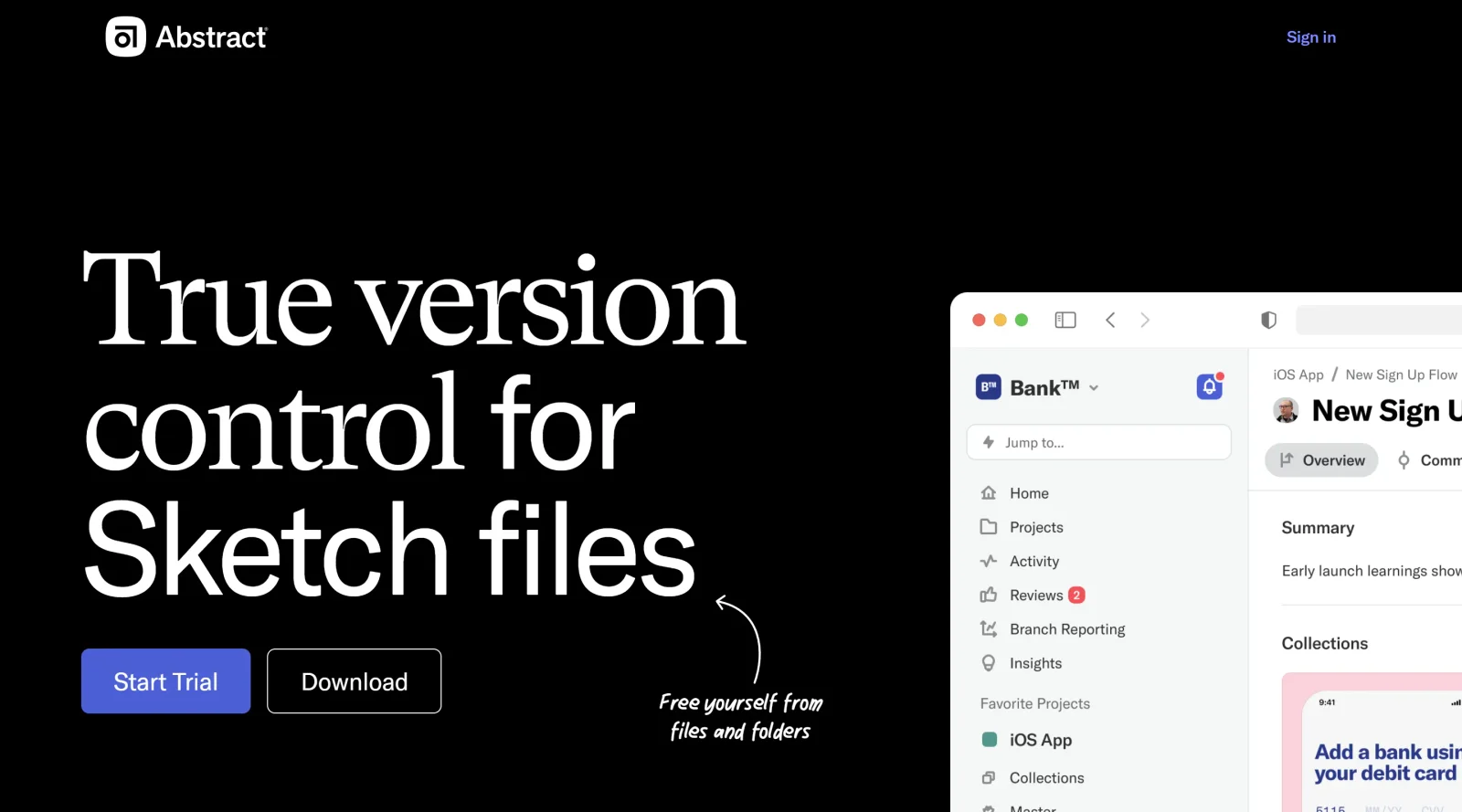 Abstract is a paid design tool in the **design** category that provides version control for Sketch files on macOS. It enables designers to manage design projects through a Git-based system adapted for visual workflows, eliminating the need for command-line operations. Abstract fits into collaborative design processes by handling file organization, change tracking, and team feedback within a dedicated desktop application.