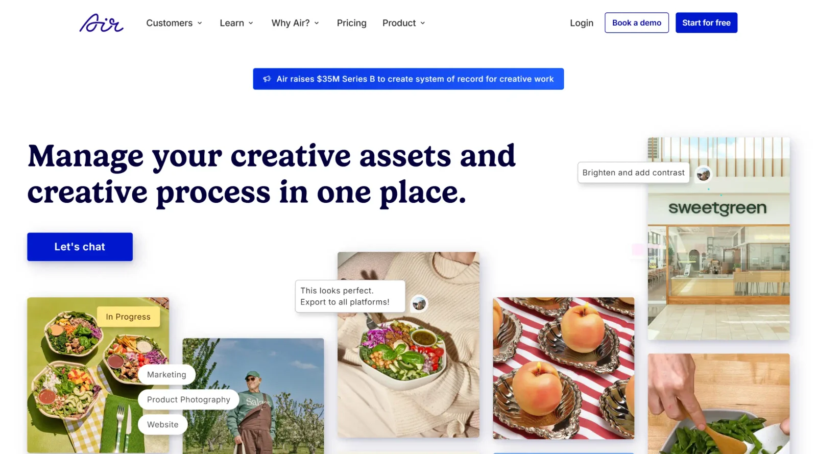 Air is a digital asset management platform in the design category, focused on organizing, searching, and collaborating on creative assets like images, videos, and documents. It serves as a central hub for creative teams to handle design files and media throughout the workflow, from upload to approval. Air operates on a freemium pricing model, providing core features at no cost with premium options for advanced use.