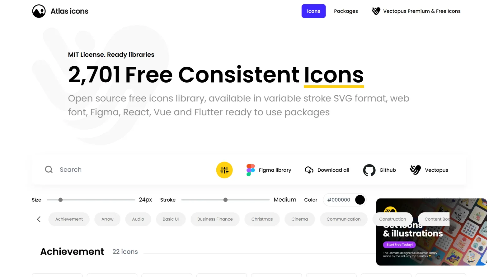 Atlas Icons is a free icon library in the design category, offering over 2600 consistent line icons developed by Vectopus. It provides open-source SVG icons under the MIT license for commercial use, suitable for UI/UX design workflows where designers and developers need scalable vector graphics to enhance visual elements.