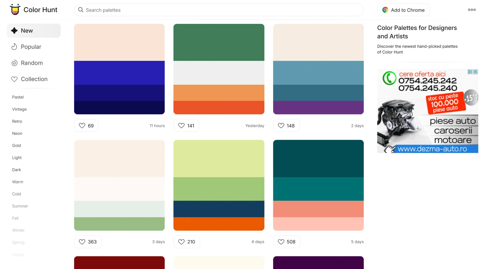 Designers and developers use Color Hunt at various stages of the design process. Web designers can select palettes to maintain color consistency across website designs. Digital marketers may use the platform to find on-trend color schemes for campaigns and social media graphics. UI designers can explore harmonious color combinations before applying them to interface designs. The tool also works well for those seeking quick visual reference — the Chrome extension displays a random palette each time a new tab opens, providing continuous design inspiration during a workday.