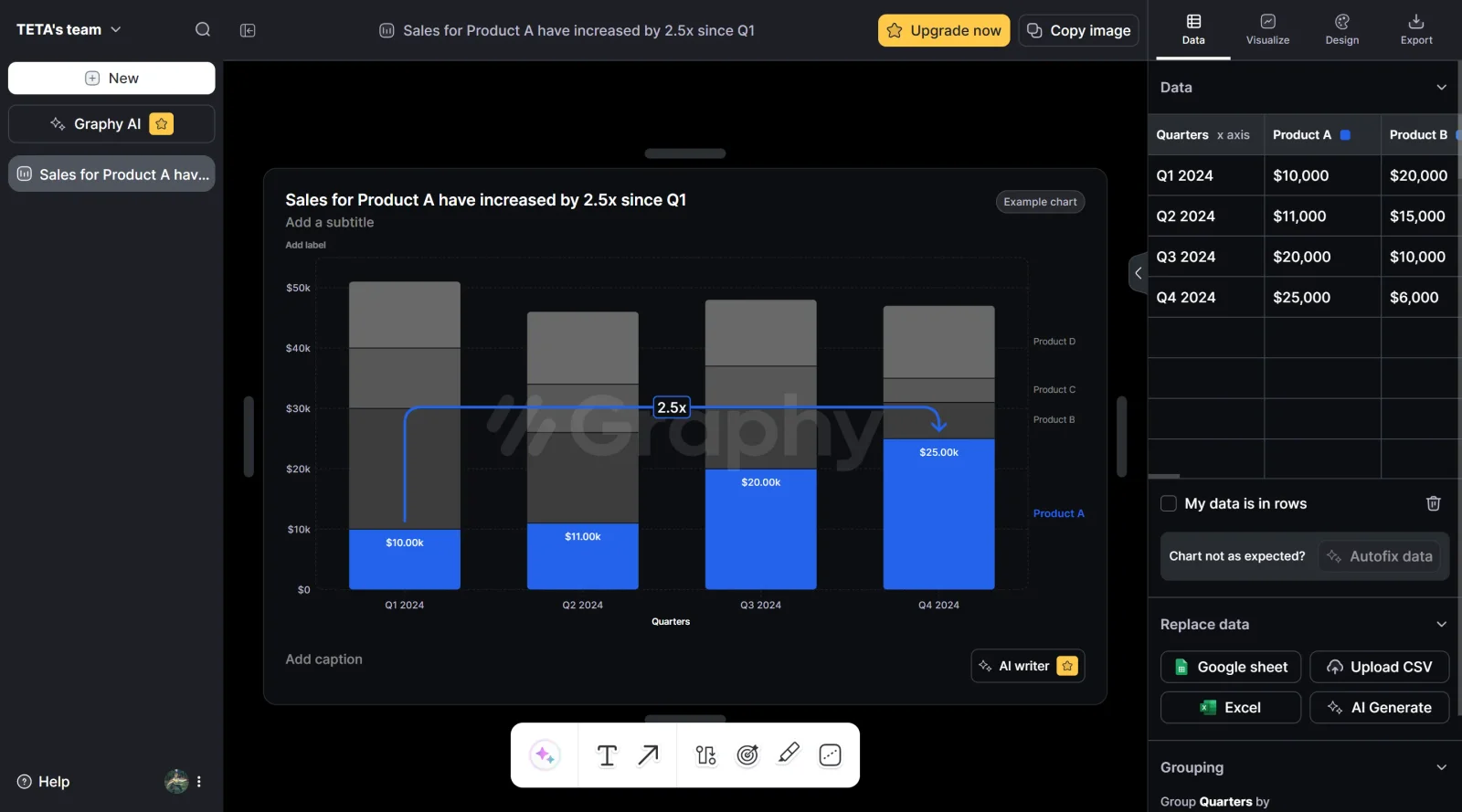 Graphy is a free-to-paid data visualization tool designed to transform raw data into interactive graphs and charts without requiring coding expertise. As an AI-powered solution, Graphy simplifies the process of creating visual representations of data by accepting input from multiple sources—Google Sheets, CSV files, Excel spreadsheets, or manual data entry—and automatically generating professional visualizations. The tool fits into the broader category of UX and design tools, serving users who need to communicate data insights visually but lack advanced technical skills.
