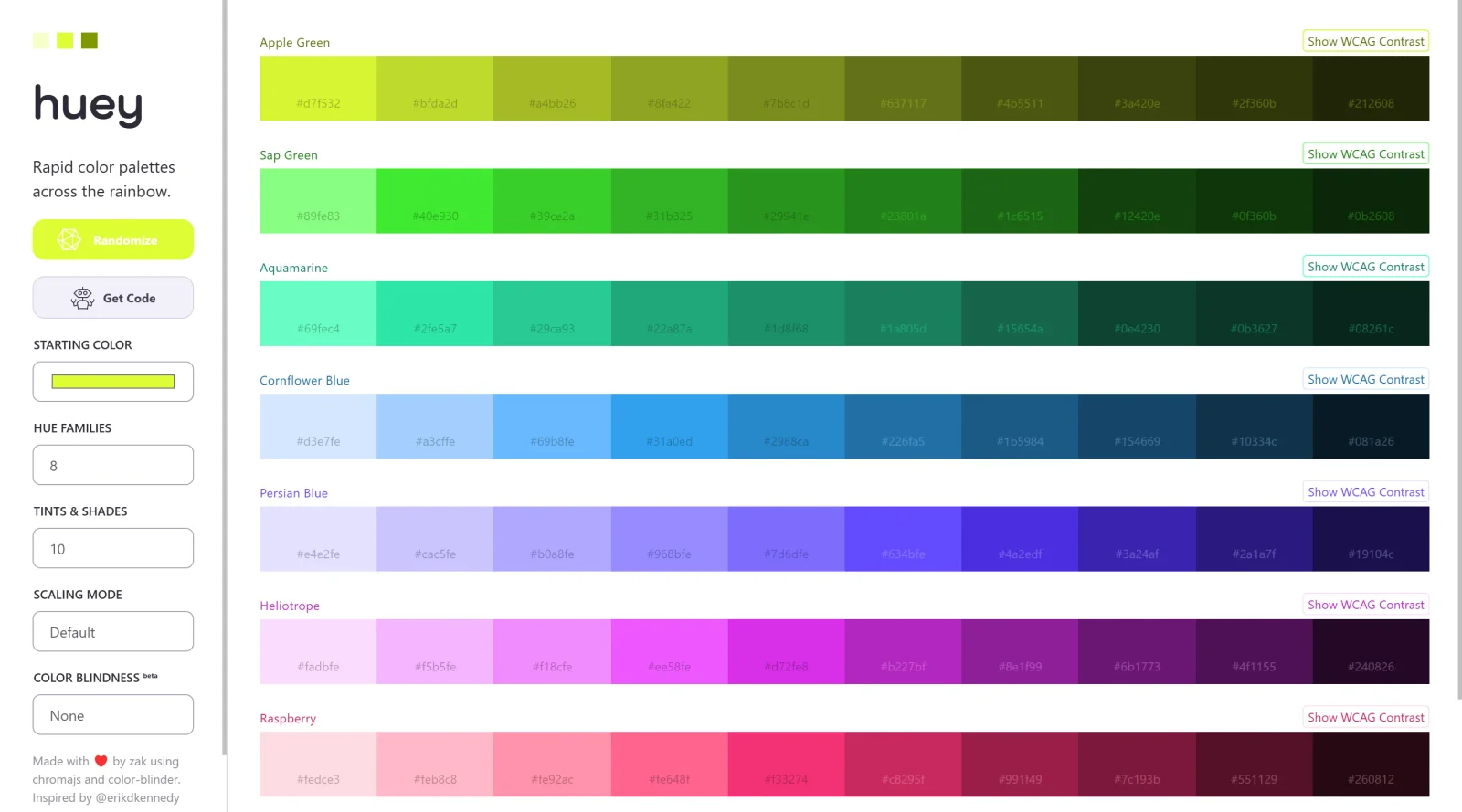 Huey is a free color palette generator in the color tools category that enables users to rapidly create color palettes across various hues of the rainbow. Its core purpose is to generate complete color families instantly, supporting designers and developers in building cohesive color schemes for web and UI projects. Huey fits into the early stages of the design workflow, where establishing a brand's color foundation is essential before applying styles in code or mockups.