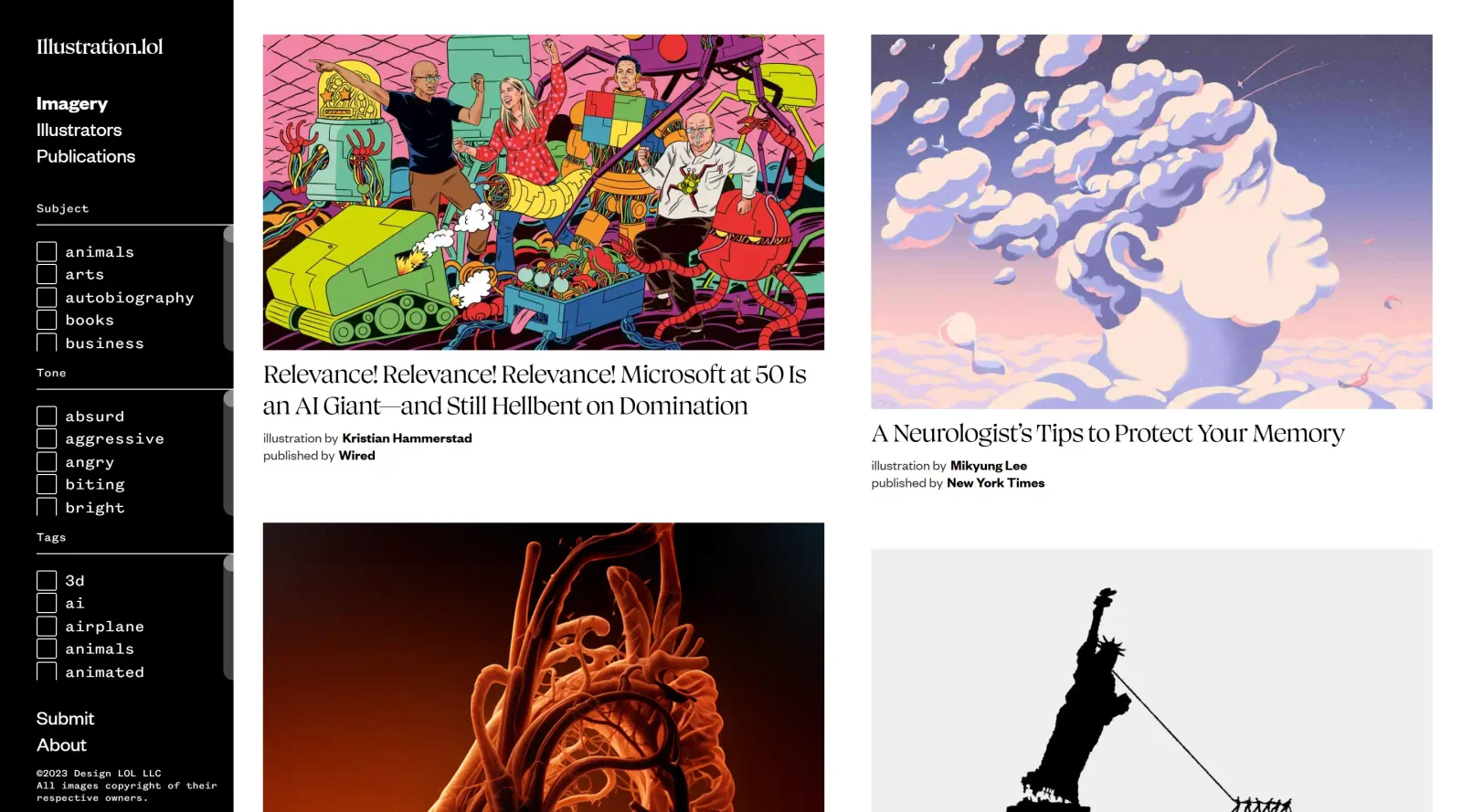 Illustration.lol targets art directors, illustrators, and creative professionals needing curated editorial illustration inspiration rather than generic stock imagery. It suits roles involving visual research for publications, advertising, or editorial design, particularly those working on projects requiring specific moods or cultural references. Experience levels range from emerging illustrators exploring styles to seasoned art directors sourcing talent globally. Visit Illustration.lol