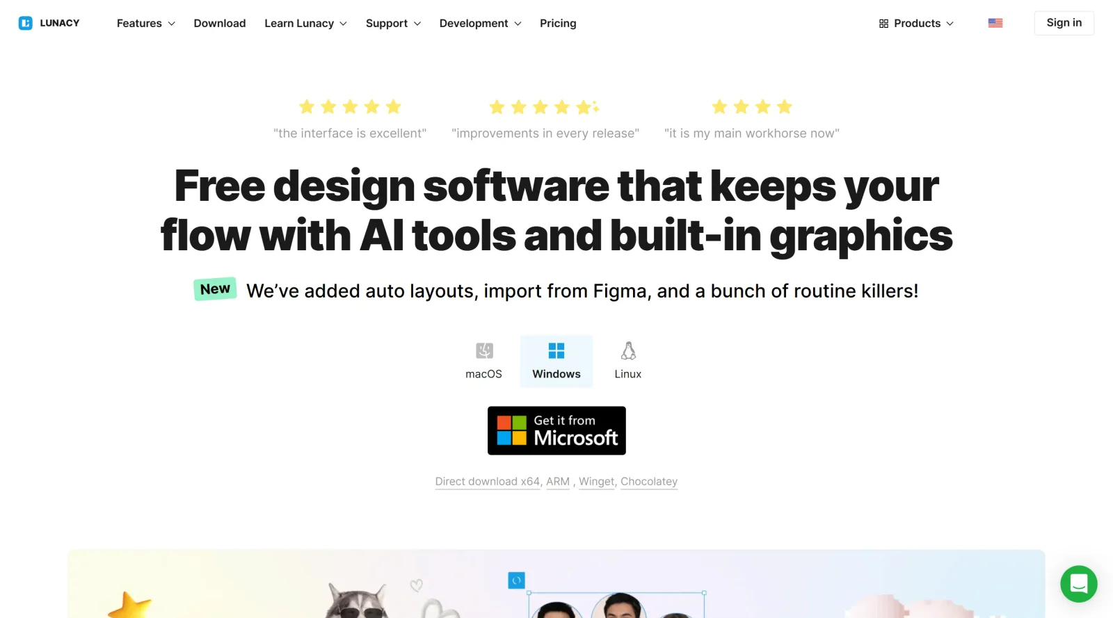 Lunacy is a free, cross-platform graphic design tool developed by Icons8 that combines traditional vector design capabilities with artificial intelligence features and an extensive built-in asset library. Available for Windows, macOS, and Linux, Lunacy serves as an alternative to subscription-based design software like Figma and Sketch, offering UI/UX design, web design, and illustration capabilities without requiring a paid subscription. The tool is built for designers who want professional-grade features without platform restrictions or recurring costs.