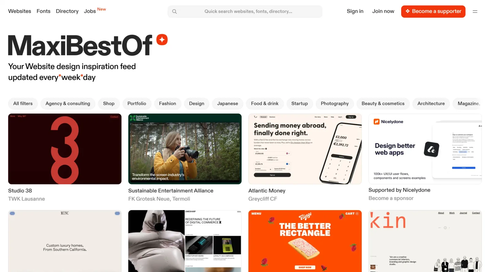 MaxiBestOf is a free inspiration tool that provides a curated feed of website designs and fonts. It serves designers seeking visual references by delivering daily updates of selected web examples and typefaces, fitting into the early stages of the design workflow where gathering ideas precedes creation. As an inspiration resource in the inspiration category, MaxiBestOf organizes content into categories like business, fashion, and technology, with new additions every weekday.