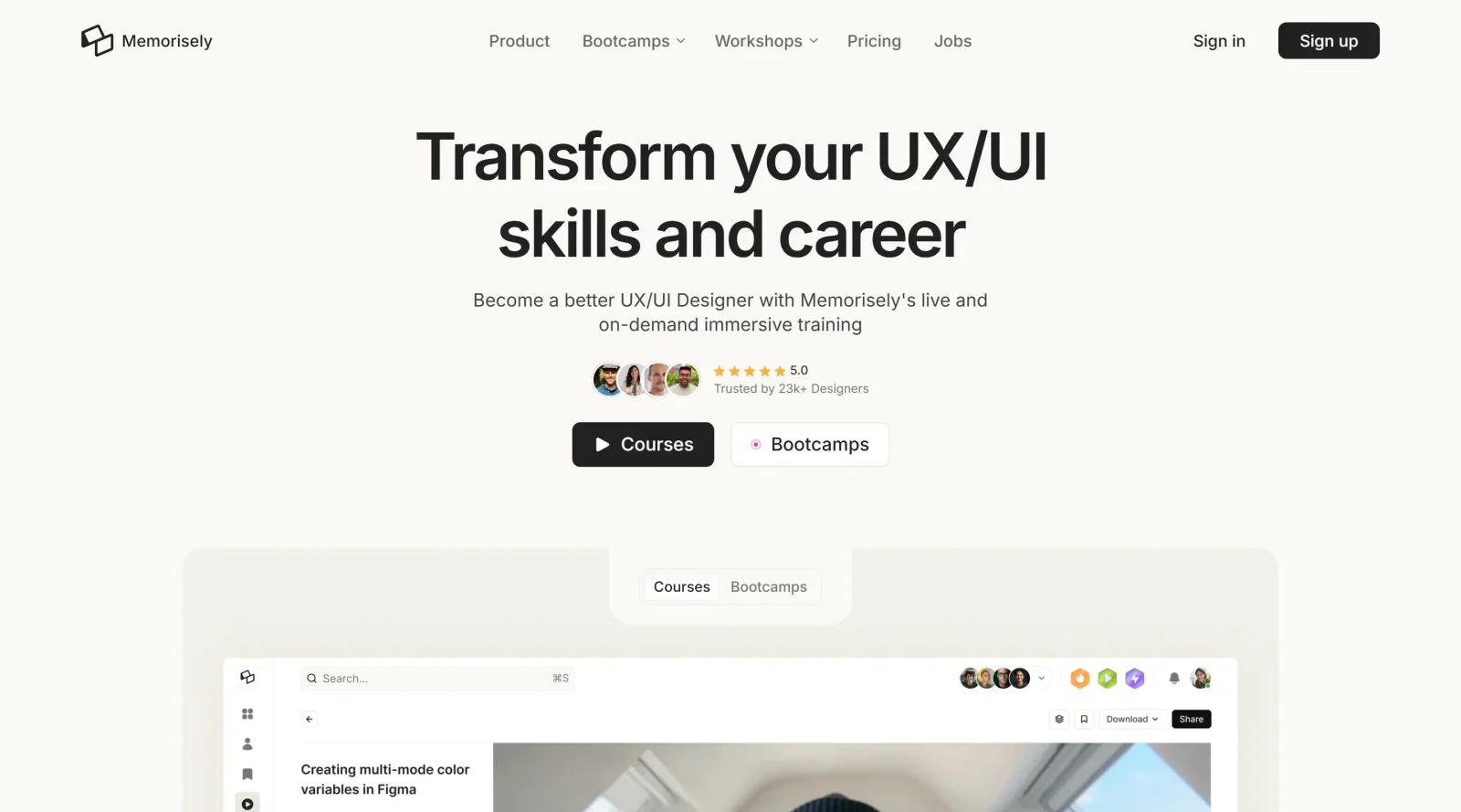 Memorisely is a fully online educational platform that delivers micro classes and bootcamps focused on UX/UI design, UX research, web design, and development skills. Its core purpose is to provide hands-on training through live cohorts, on-demand video courses, and workshops, enabling learners to build practical expertise in tools like Figma and AI-driven workflows. Memorisely fits into the educational category of design resources as a paid service, with bootcamp pricing around $3,450 upfront or $987 monthly, alongside subscription options for individual courses starting under $3 per week.