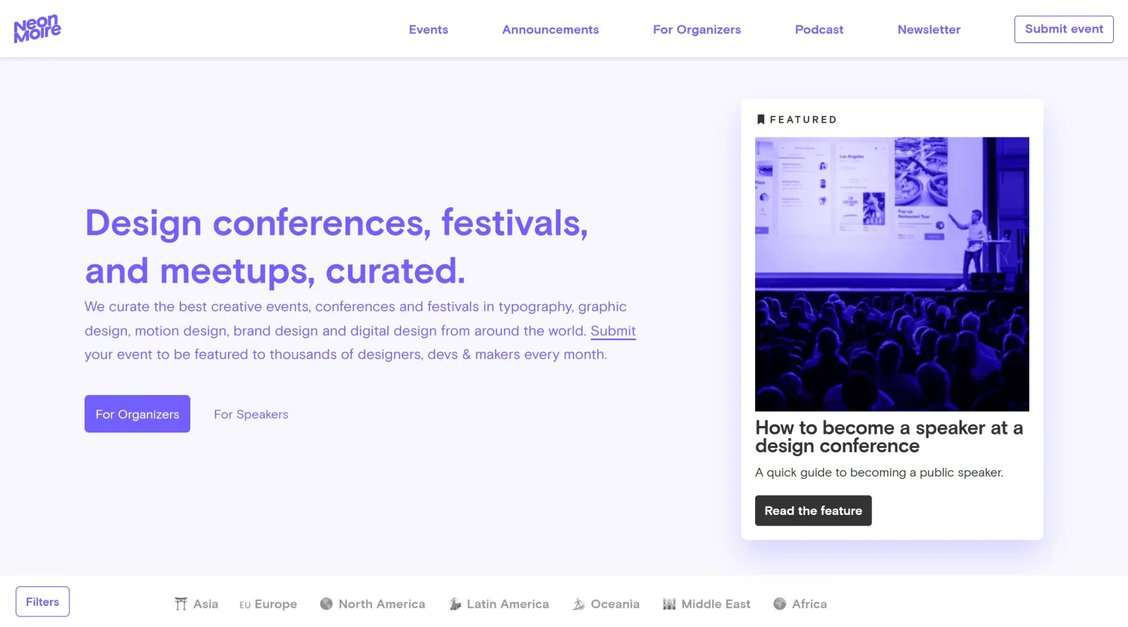 Neon Moiré serves graphic designers, typographers, interaction designers, and other creative professionals tracking global events. It suits beginners exploring design festivals and experienced practitioners attending specialized conferences or summer schools. Event organizers and teams planning professional development also benefit from its curated lists and tools. Visit Neon Moiré