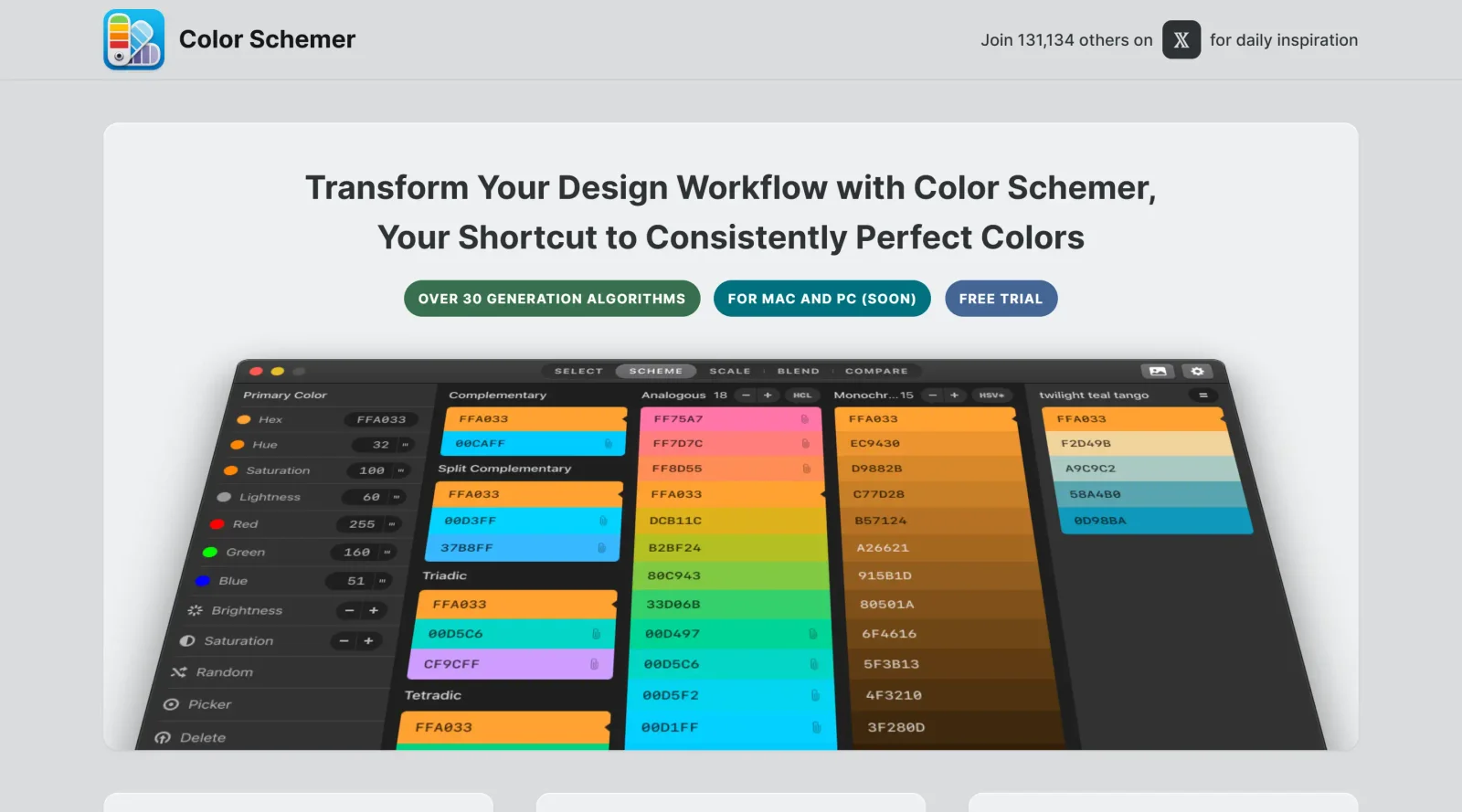 - Produces harmonious combinations using schemes like analogous, complementary, or triadic based on the base hue.