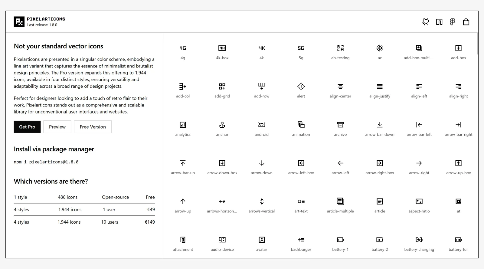 Pixelarticons is an icon library offering pixel-art style icons constructed on a 24x24 pixel grid. These single-color icons suit retro, minimalist, brutalist, and unconventional design projects, with a free version providing 486 open-source icons and a pro version expanding to over 1,900 icons across multiple styles. Pixelarticons fits into design workflows where developers and designers need scalable vector assets for web and app interfaces, available under a free-paid pricing model.