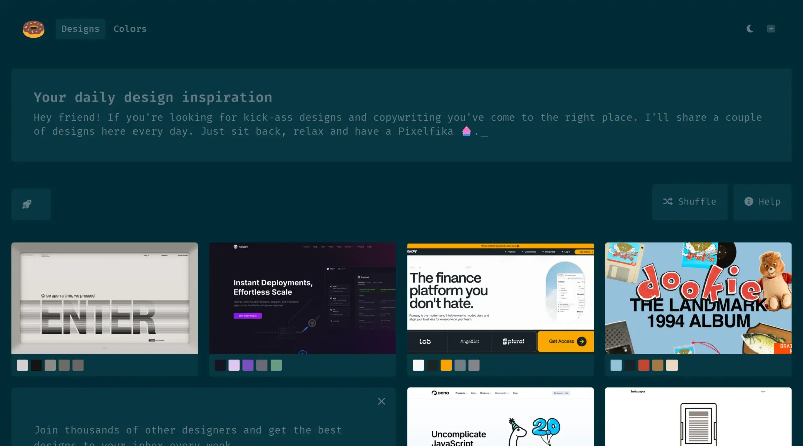 Pixels is a free inspiration tool that curates web designs and copywriting examples to provide designers with visual and textual references. It serves as a resource in the inspiration category of design tools, helping users discover layouts, typography, and content approaches without cost. Pixels fits into the early stages of the design workflow, where gathering ideas precedes sketching or prototyping.