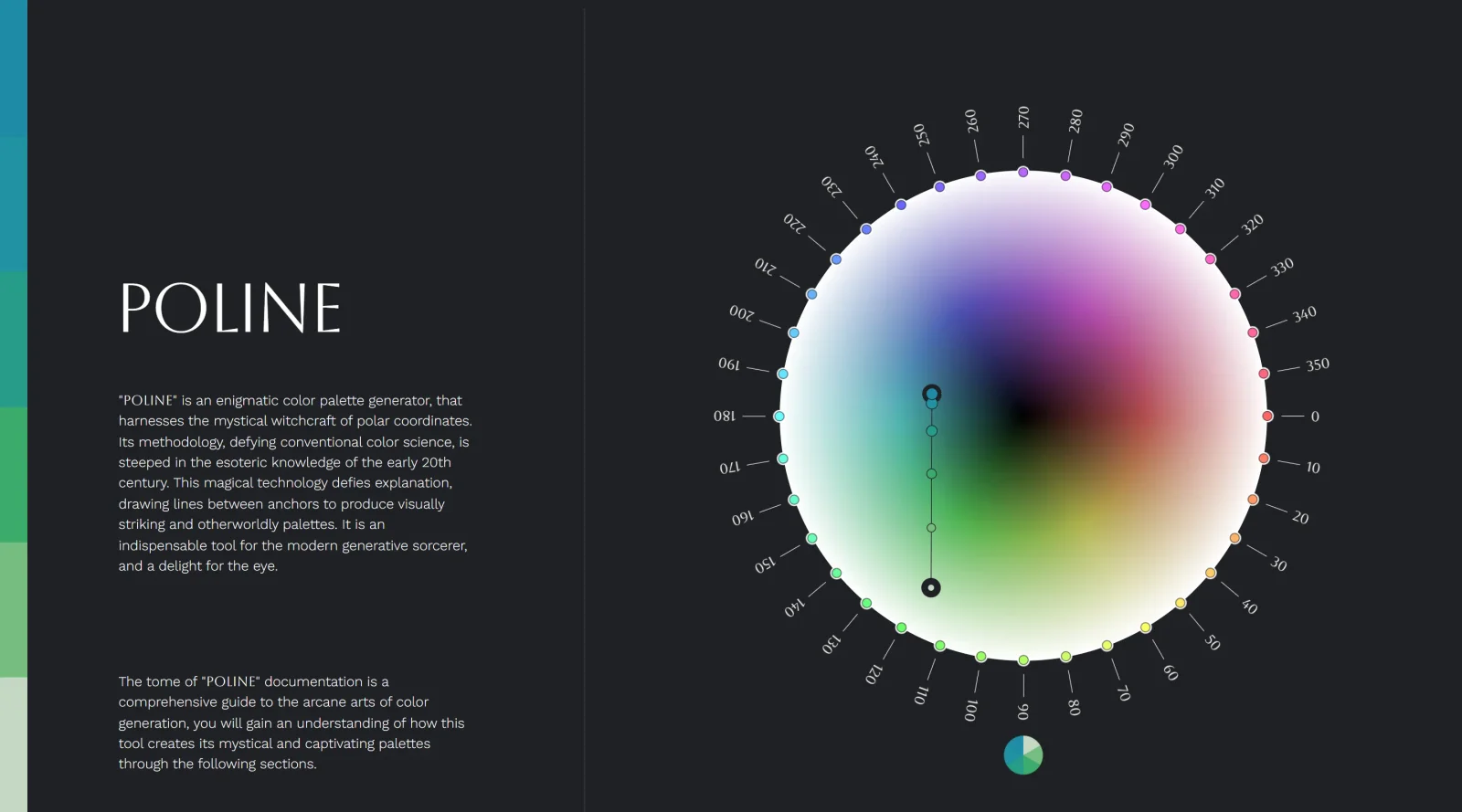 Poline is a free, open-source color palette generator that uses polar coordinates to create harmonious color schemes. Written in TypeScript and available as a lightweight, dependency-free JavaScript library, Poline generates color palettes by drawing lines between anchor points in polar HSL color space. Rather than applying simple linear blending between colors, Poline calculates transitions using polar coordinate mathematics, producing visually distinctive and expressive palettes suited for UI design, data visualization, and generative creative work.