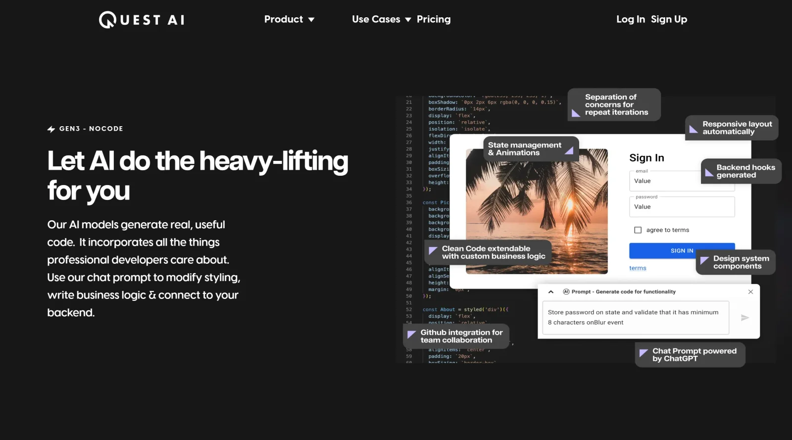Quest is a paid website builder that converts designs into ready-to-launch websites. It operates as a web-based platform in the **website-builders** category, enabling users to transform Figma designs into production-ready React components and responsive web pages. Quest fits into the design-to-development workflow by automating the handoff from visual prototypes to functional code, supporting common frameworks and design systems.