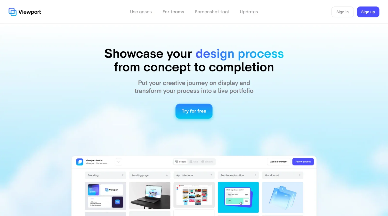 Viewport is a free platform in the community category designed for designers to share ideas and engage in discussions. It serves as a centralized space where freelancers and design teams organize and present their design processes in a clear, shareable format. Viewport fits into the design workflow by enabling communication beyond traditional tools like Figma, which handle creation but limit process sharing and iteration feedback.