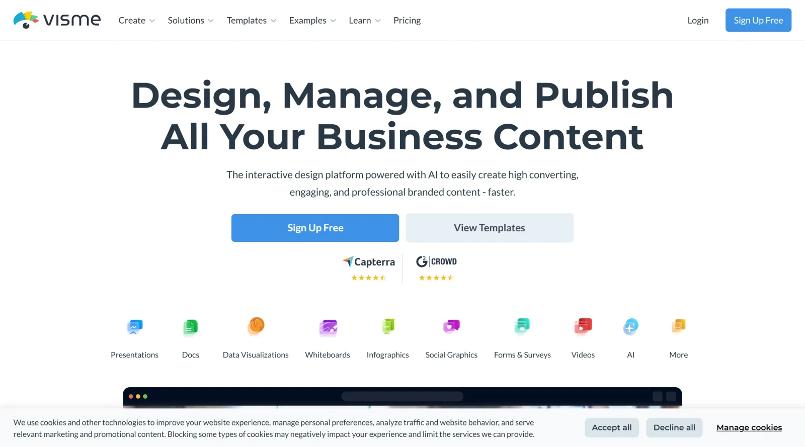 Visme is an all-in-one platform in the design-tools category that enables users to create presentations, infographics, documents, and other visual content. It operates on a freemium pricing model, providing core features at no cost with premium options available for advanced functionality. Visme fits into design workflows by offering tools for non-designers to produce professional visuals without requiring specialized software, supporting tasks from initial creation to collaboration and sharing.